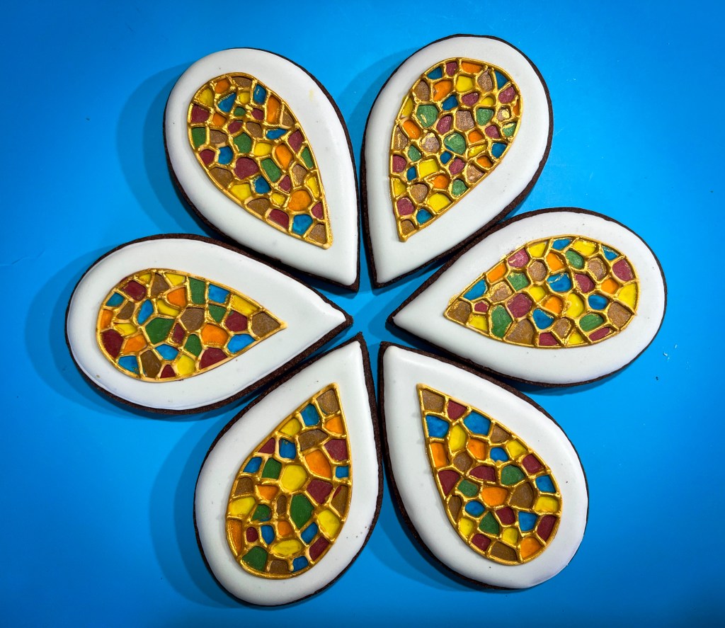To make this design, I started by flooding with with and allowing it to set. Then I used a light food safe pen to draw the design, and filled the sections with different colors, all using food pens. A little gold Royal icing in piping consistency to outline each section and the perimeter of the whole drawing. Once that set, I painted it with luster powder gold + vodka. Steps are shown below…