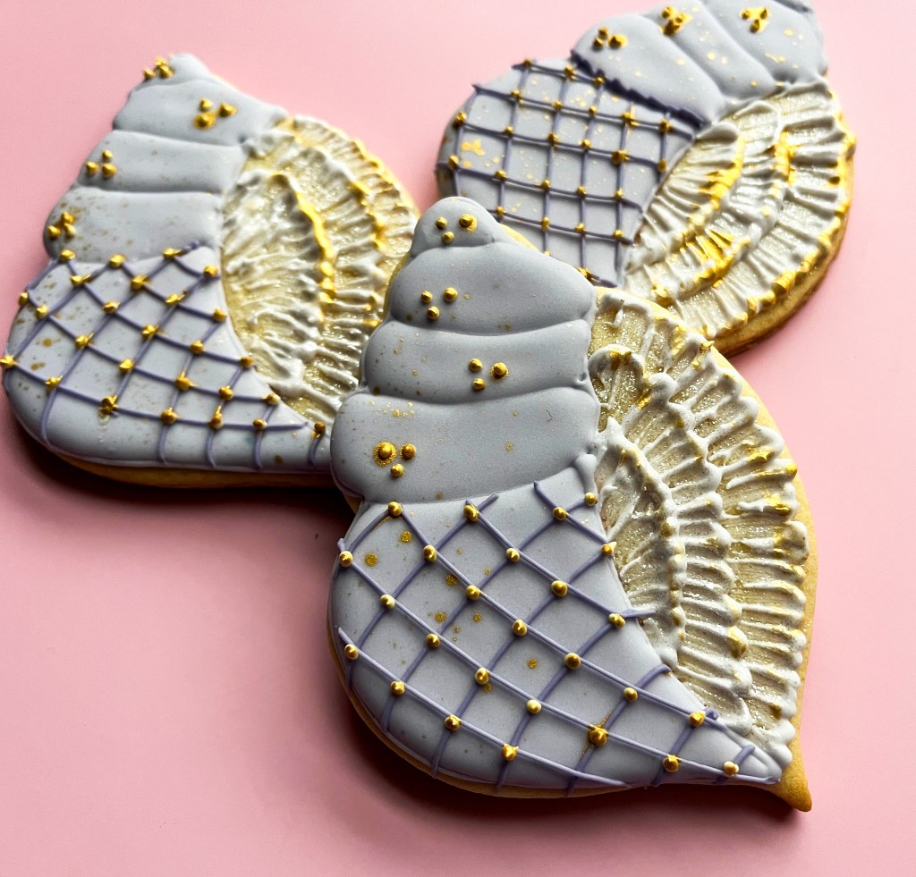 So many details! This cookie can be simplified but would you really do that when the details make it so special? I say go for it, take your time and enjoy the ride. The cookie cutter I used can be found here. First you draw the basic sections with a food safe pen, then work on brush embroidery with thick consistency white Royal icing. Once that is done, flood the different sections with the color of your choice. I used super light purple. Details are added later using piping consistency icing, just a bit darker. Gold luster for the mandatory bling. Because bling brings cookie to life! Some of the steps are shown below.
