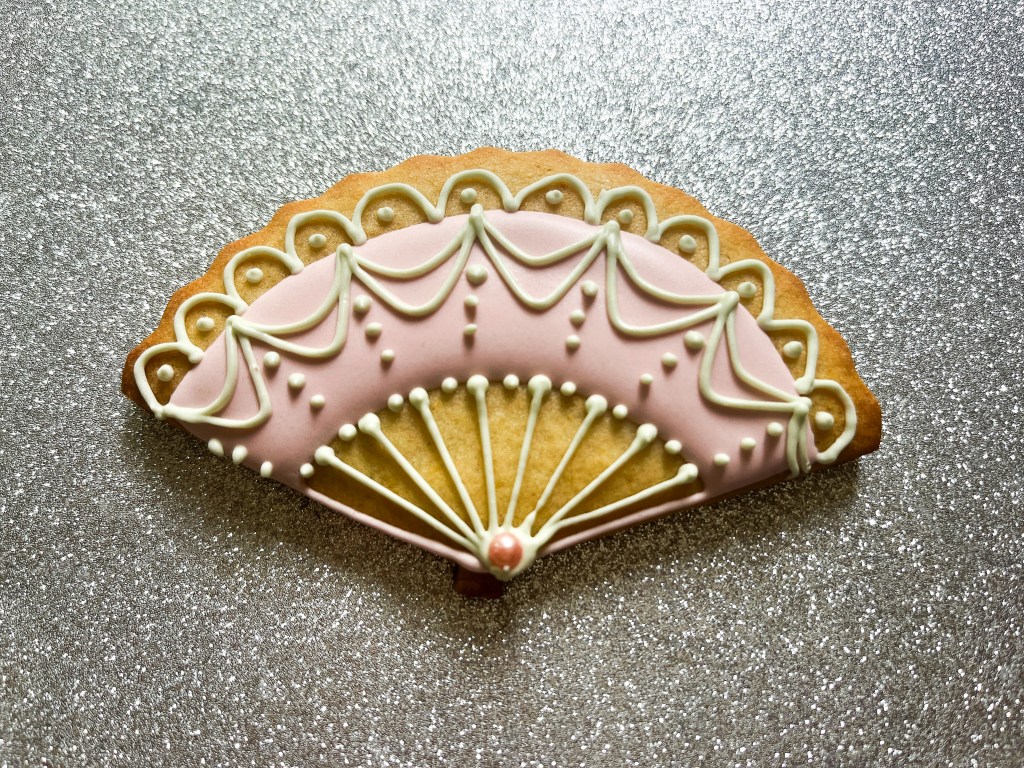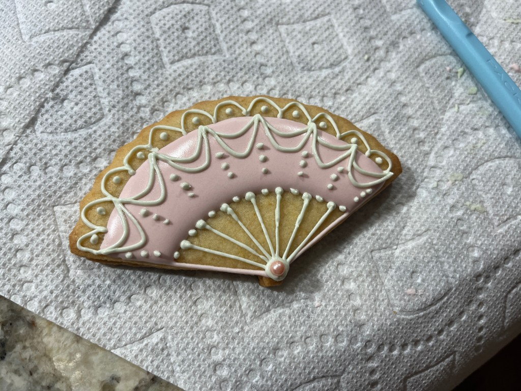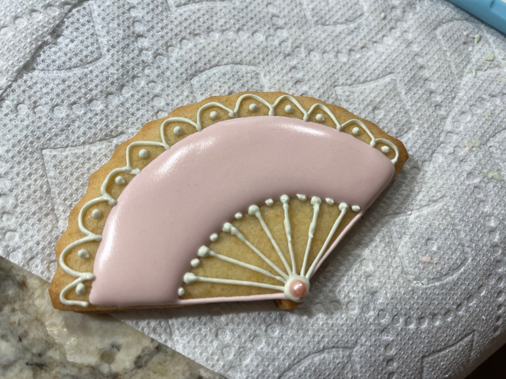 Now add the final details on top of the pink flooded area. Just try to spread them nicely over the area, if needed, practice on a piece of parchment paper with the shape of the cookie sketched on it.