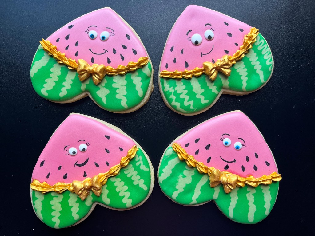 A little fondant bow completed the look, and of course, the facial features plus the watermelon seeds were added once the surface was fully set. Plan two days to have these cookies completed, and you will have no issues. I promise!