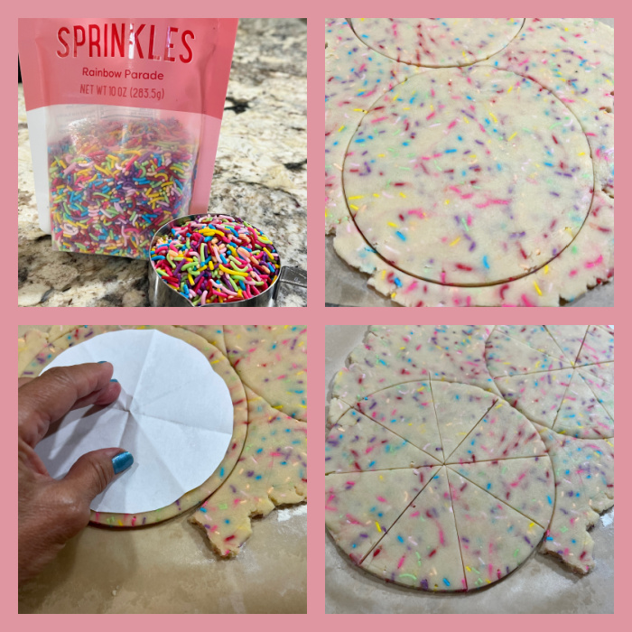 All you need as a starting point is a large circular cookie (if you don’t own a large cutter, use an inverted bowl to cut the shape by hand. Make two of those and cut each into 8 equal wedges (I made a little template with paper to help me visualize where to cut the pieces).