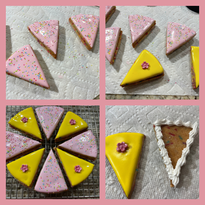 Once the cookies are baked, you will decorate just the top, I used two different colors and two different styles, one adding nonpareils right after flooding, and the other adding a little fondant flower.
