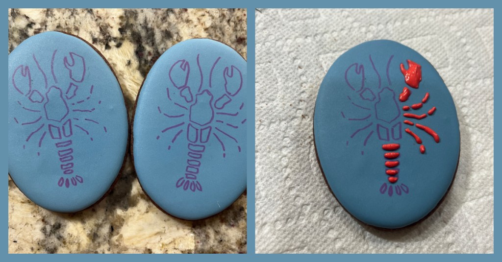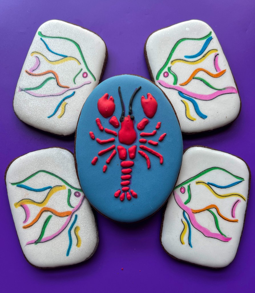 Both designs (fish and lobster) relied on a mini-projector to get the basic image over an iced cookie (icing fully set, made the day before). The fishes were made with food safe pen, fine tip for black, thicker tip for all other colors (I love this set). The lobster was piped with medium consistency red icing and a tipless bag with a very small opening cut with scissors.