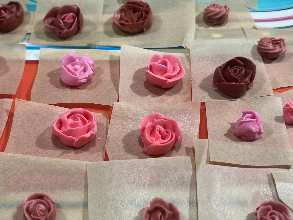 She taught how to make several styles of roses, including some shaped around toothpicks, but I failed at those. Need to try again in the future. I made them all over parchment paper.