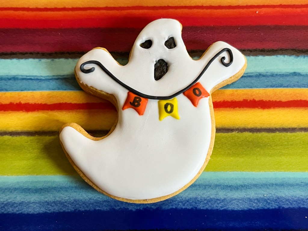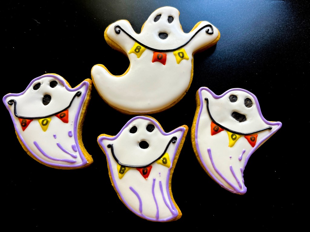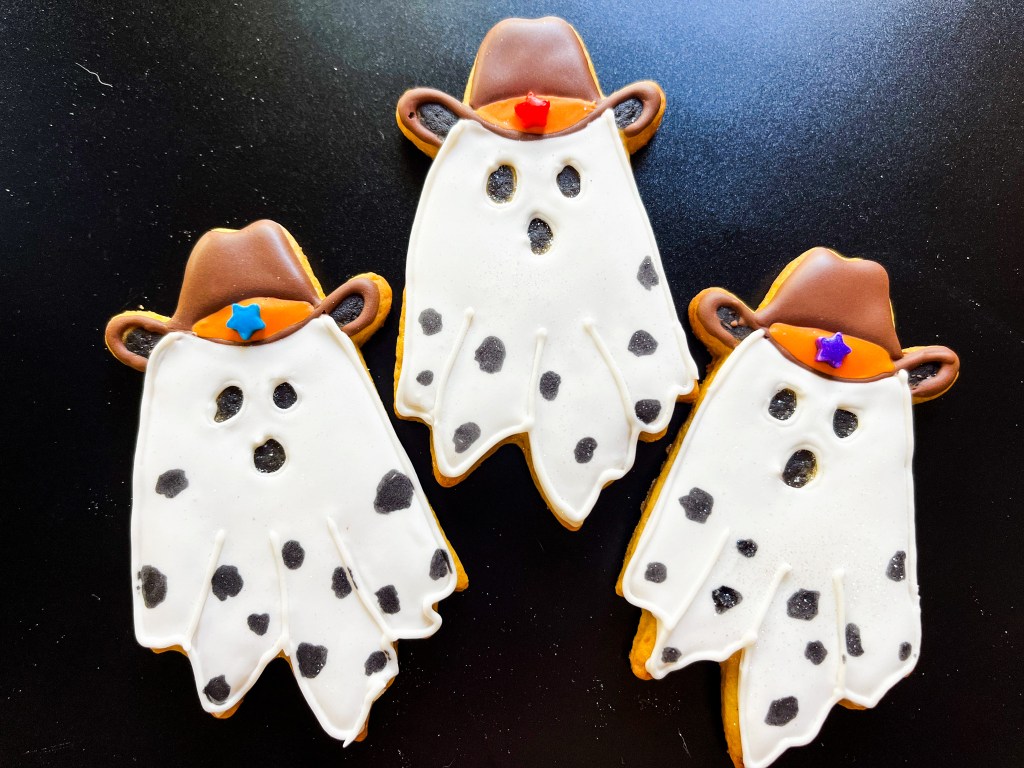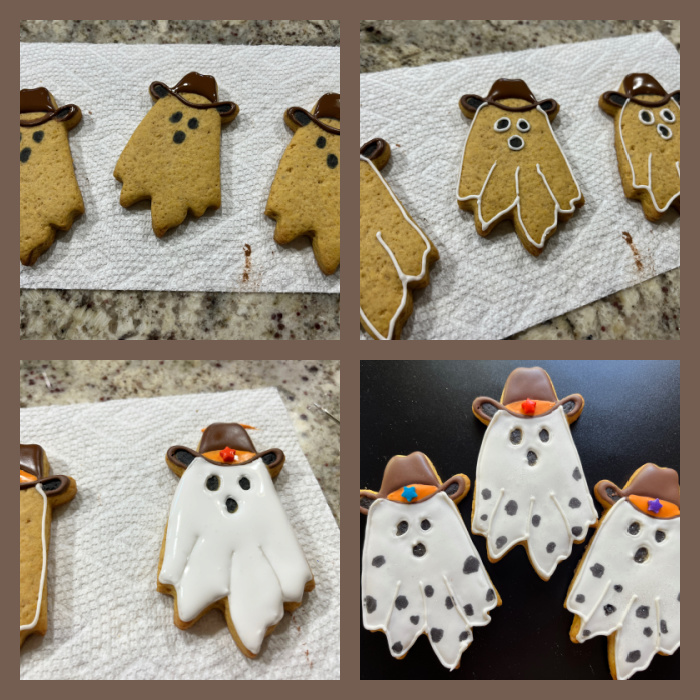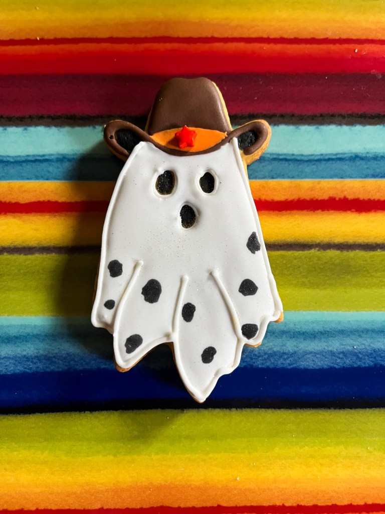 I’ve had this cowboy ghost cookie cutter since last year but did not get to it until it was too late, so I corrected my mistake and brought it to play before Halloween passes me by. I think the leather hat and the cow spots (could those be Dalmatian, maybe?) were irresistible… I improvised the decoration from stuff I saw around the net, steps are straightforward and shown below.