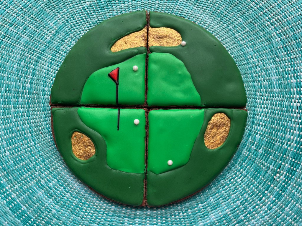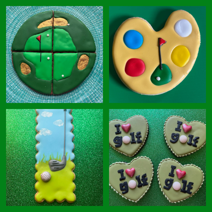Super simple, flood with green, add a black golf bag, and just do the outlines with metallic food safe pen.