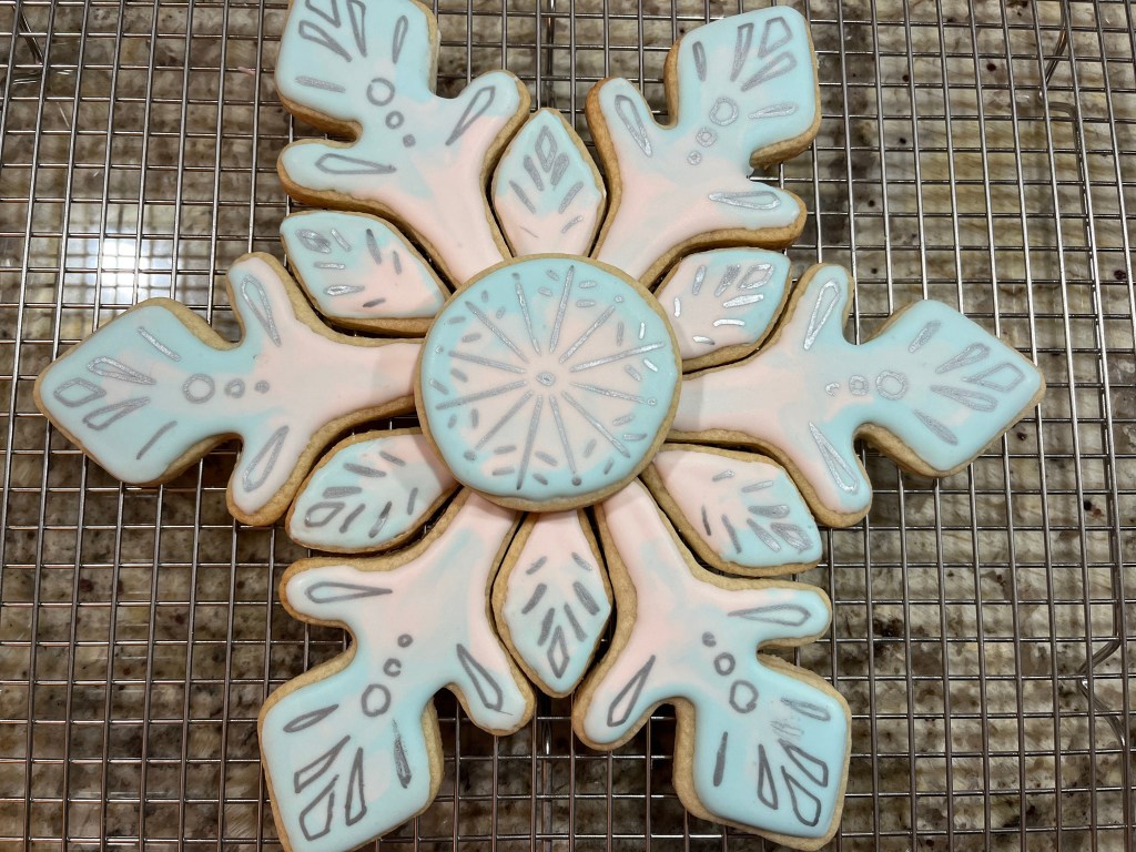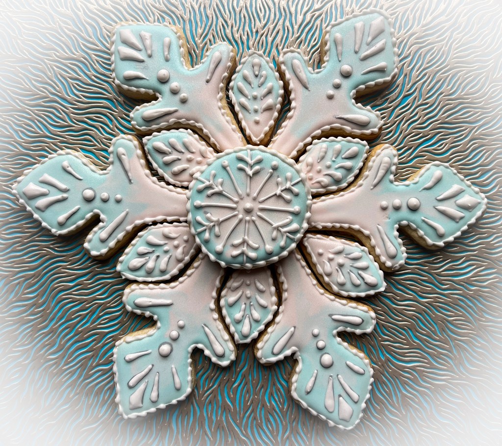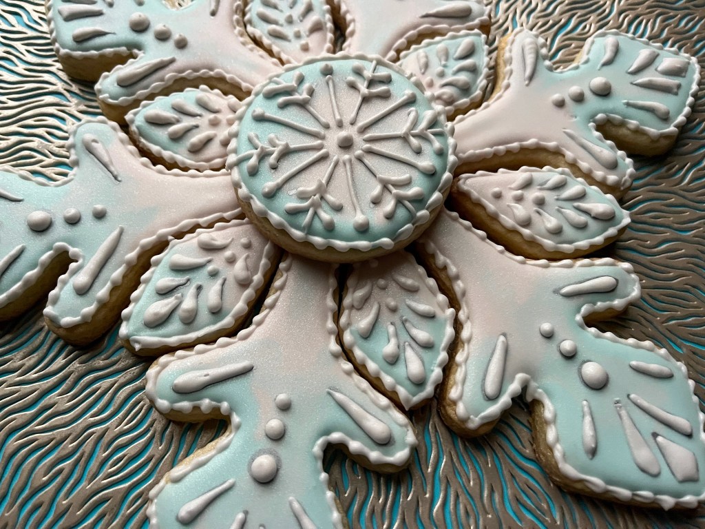 I have learned a lot from Marlyn, and often browse through her tutorials on Patreon to search for new cookie adventures. The same set of cookie cutters were used in the past to make her Chinese New Year celebrating the tiger (click here for a flashback). It was a real marathon in decorating, but still stands as one of my favorite projects of all time. By comparison, this snowflake platter is much simpler. But I am totally in love with it!