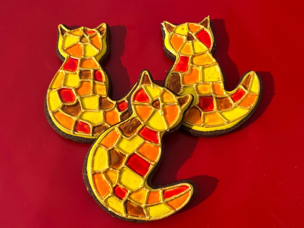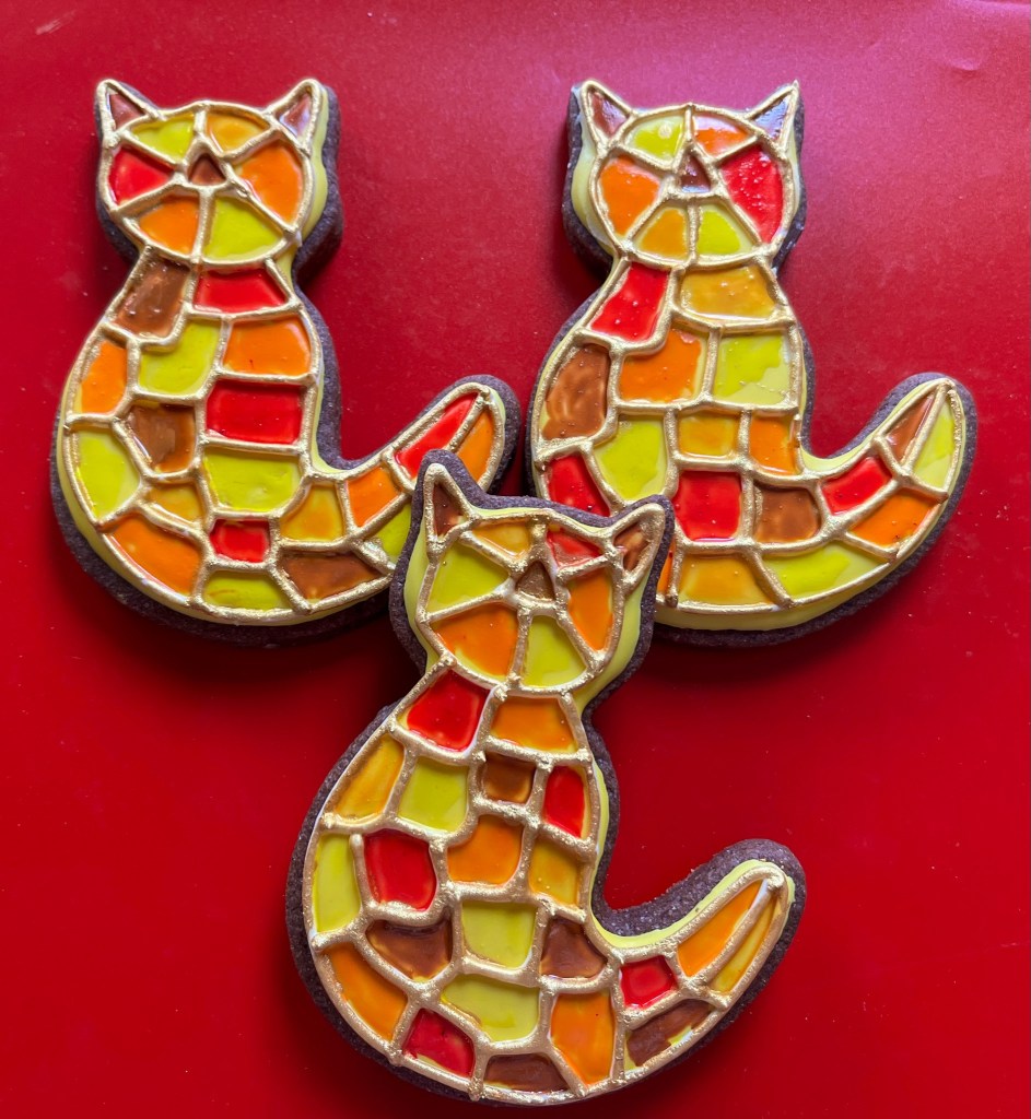 Stained-glass is a passion of mine (one of many, as you may have noticed). For this design, I flooded cookies with gold Royal icing and then piped a random mosaic pattern. Let that set, and used Sugarprism to paint in different colors. To honor the season, I went with colors of Fall.