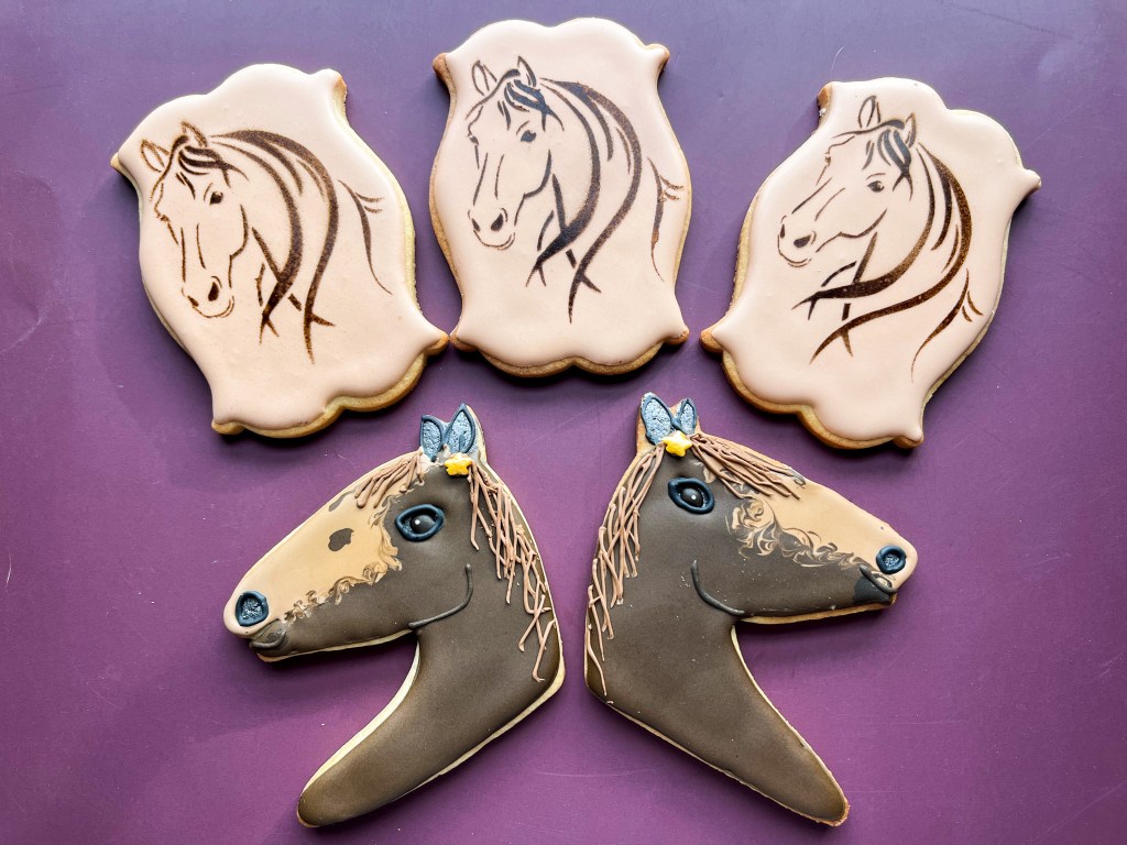 This whole set was designed after working on a recent tutorial by Haniela in her weekly live (Wednesdays at noon, Central Time). She demonstrated how to make a horse’s head, super full of details, and I decided to make a set of horse-inspired cookies. Here they are…