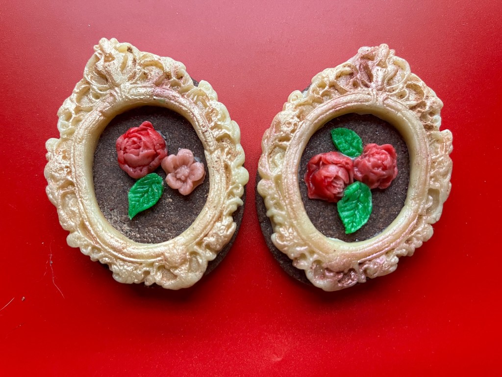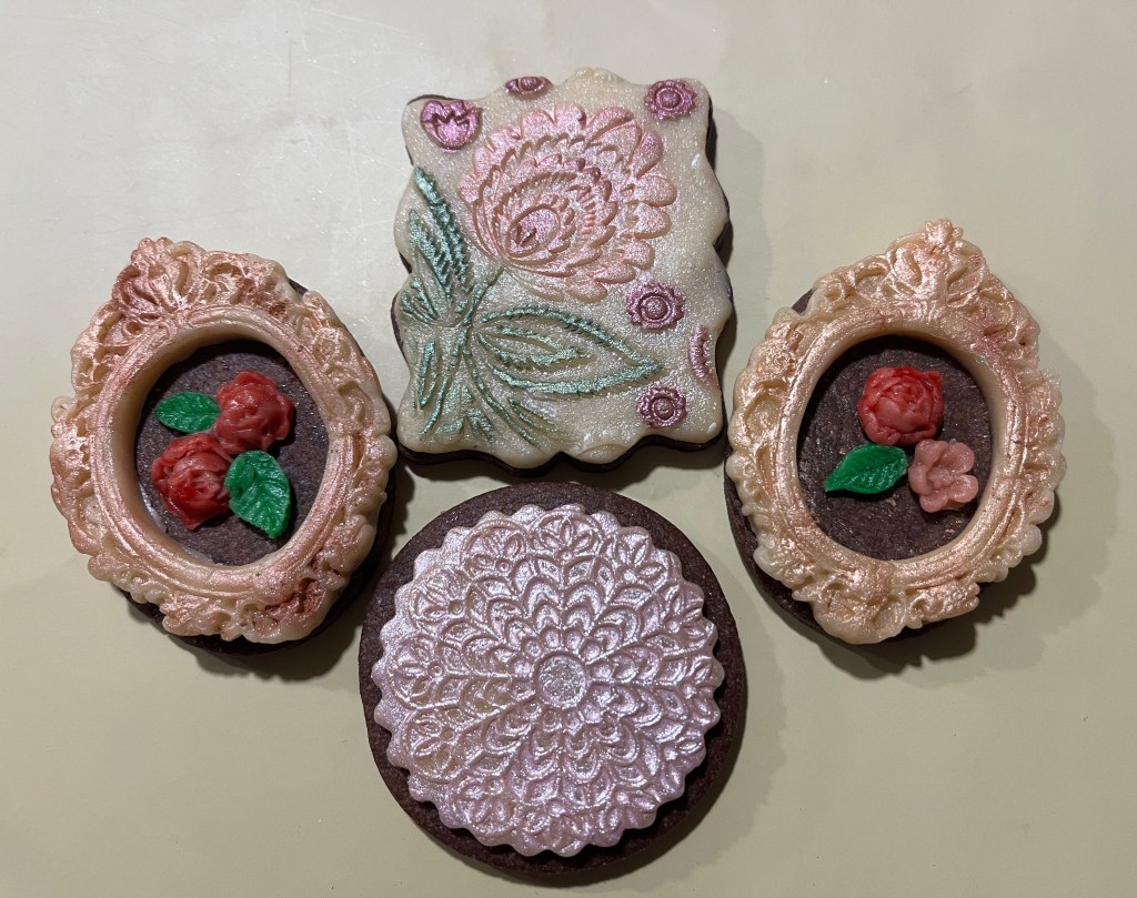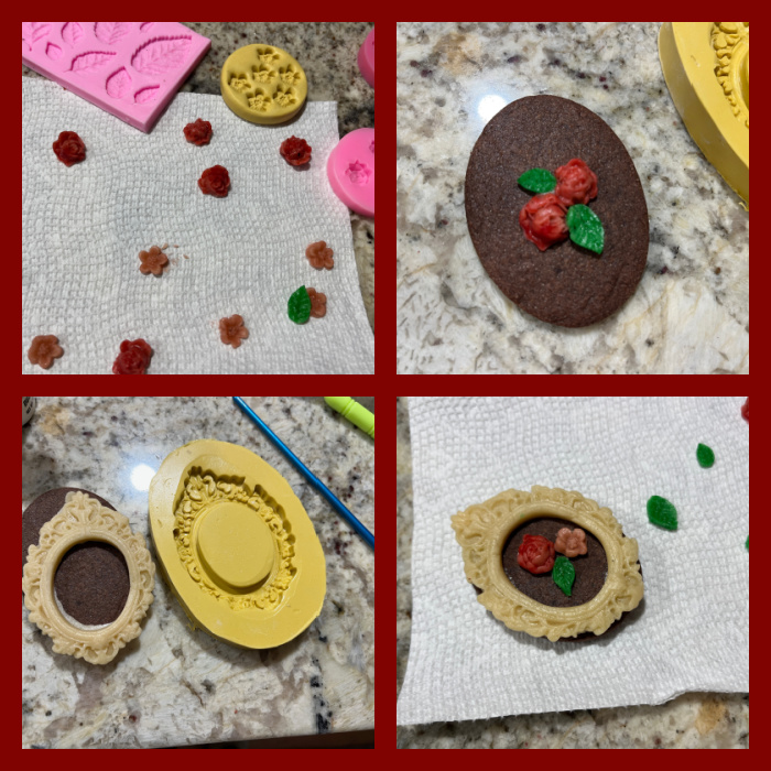 You will need silicone molds and dyed marzipan. Make flowers, leaves, and the frame. Glue them to the cookie with a mixture of corn syrup and water, or any other way you prefer (egg whites work also, as Tunde pointed out in her video).