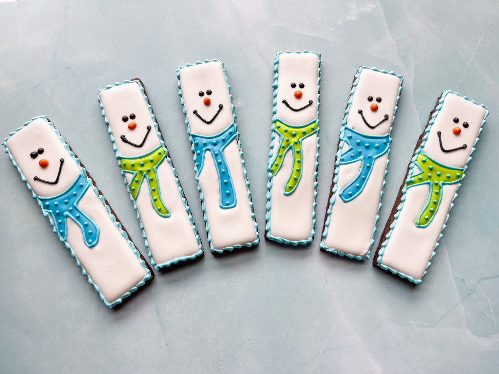 I love the stick shape so much! This is a super simple design, just flood with white leaving a space for the scarf. Wait about 10 minutes and fill the scarf area with the color of your choice. Once that sets, time to add the details with piping consistency Royal icing: black for the eyes and mouth, orange for the nose, and green or blue for the scarves. The bead border is optional, but I always like to practice it.