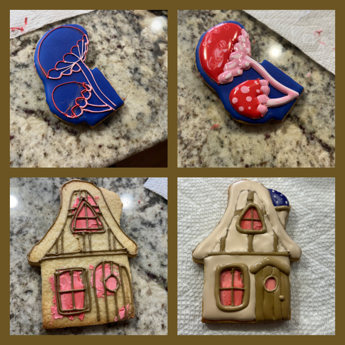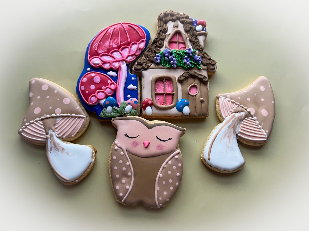 Many details in this project, starting with little mushrooms piped as Royal icing transfers. Mik provided the templates, making it quite easy. Then it is a matter of piping all the outlines of the large set of mushrooms and the house. And flooding, adding details with piping consistency icing. Some steps shown below.
