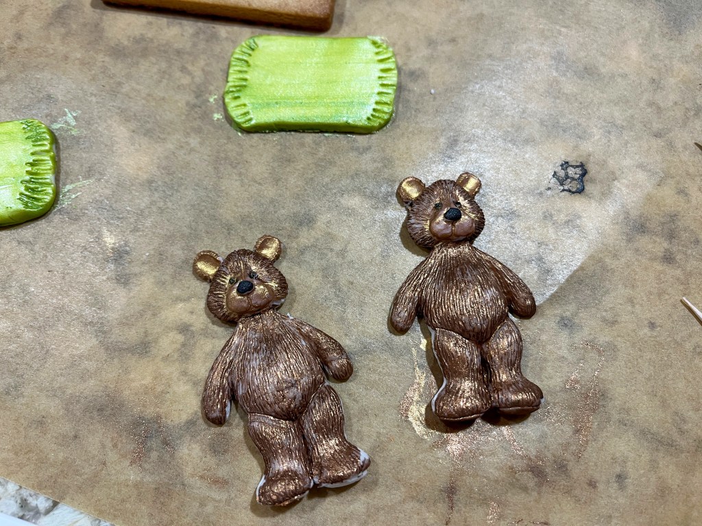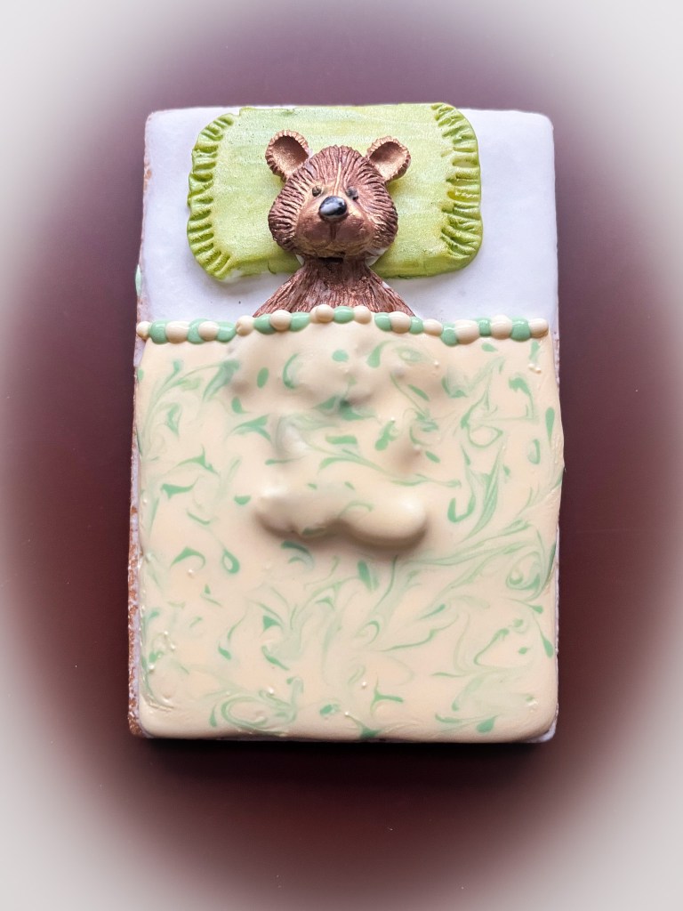I am so smitten with these cookies! I got the idea from Instagram, but modified it to use a fondant mold for the bear. I molded the pillow by hand, and made the details on the sides with a toothpick. You could conceivably mold everything by hand if you are artistic enough, or pipe the bear with Royal icing and do it as a transfer. Same for the pillow.