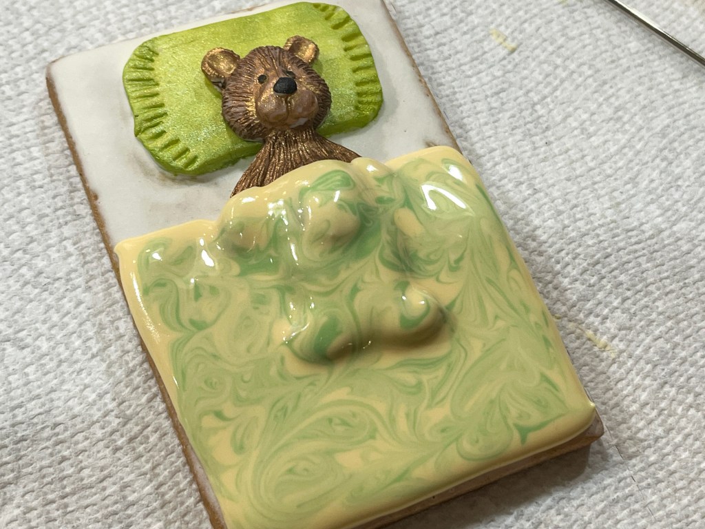 At this point, I noticed that the feet of the bear would be sticking too far up, so I carefully cut them a bit with small scissors. Poor bears, the sacrifices they have to make in the name of a cookie! Now, it was time to add the bed sheet. I used a slightly thicker than flooding consistency to make sure everything was nicely covered.