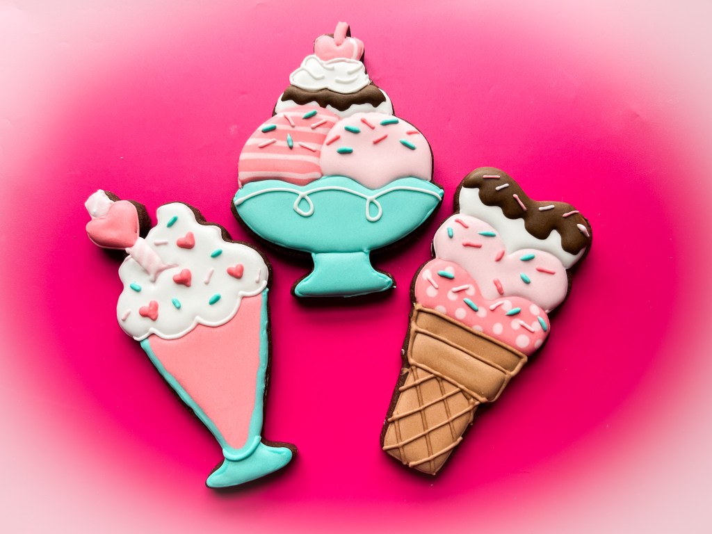 This super cute set of cookies came from an online class offered by The Flour Box (click here for details). I have taken two of their classes before and loved each one. This was a lot of fun, even if I had to mix every single color of the rainbow… totally worth it! The set comprised an ice cream truck, and three different servings of ice cream. Everything was piped by had, including the sprinkles. Are you impressed yet? 😉
