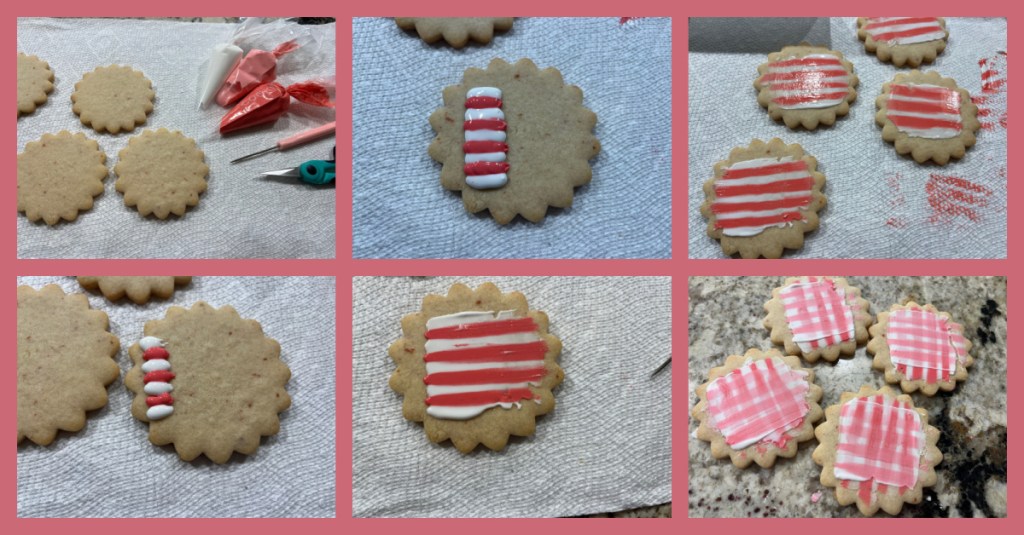 Such a cool technique! She showed how to make these cookies in a very recent live event (click here to watch it for free). It was not easy, but it is a nice approach to keep in mind. If you don’t have an air-brush and stencils, it is a good method to make the gingham design. You can learn watching the video, I share below just a few of the steps.