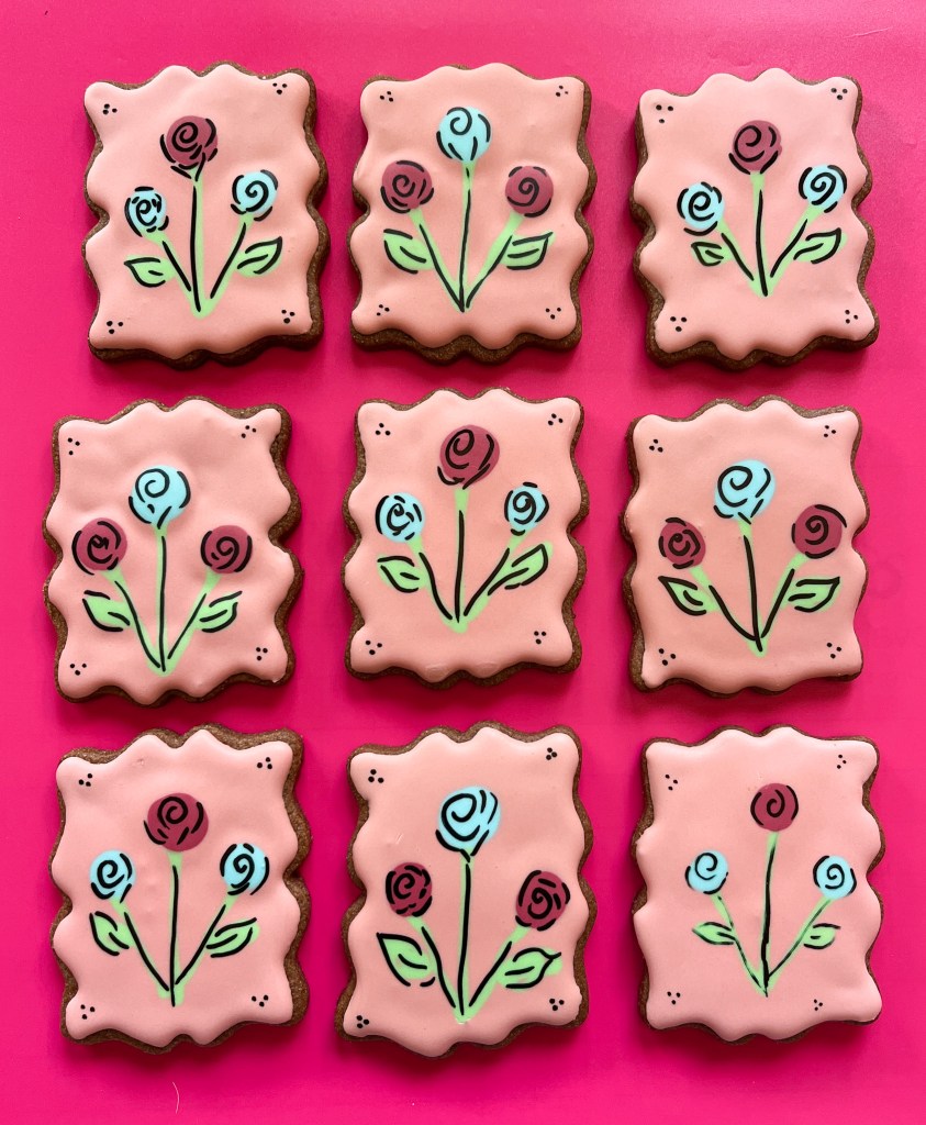 Flood the cookies and immediately add the wet-on-wet portions: stems, leaves and flowers. Once that is fully set, draw the details with a black pen.