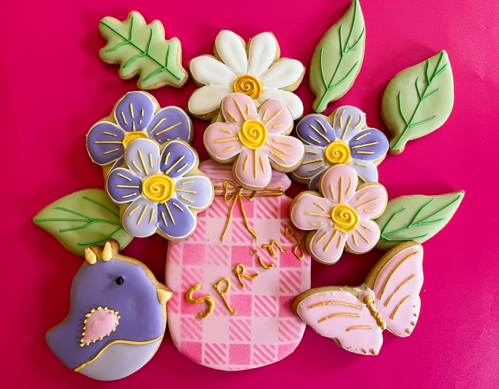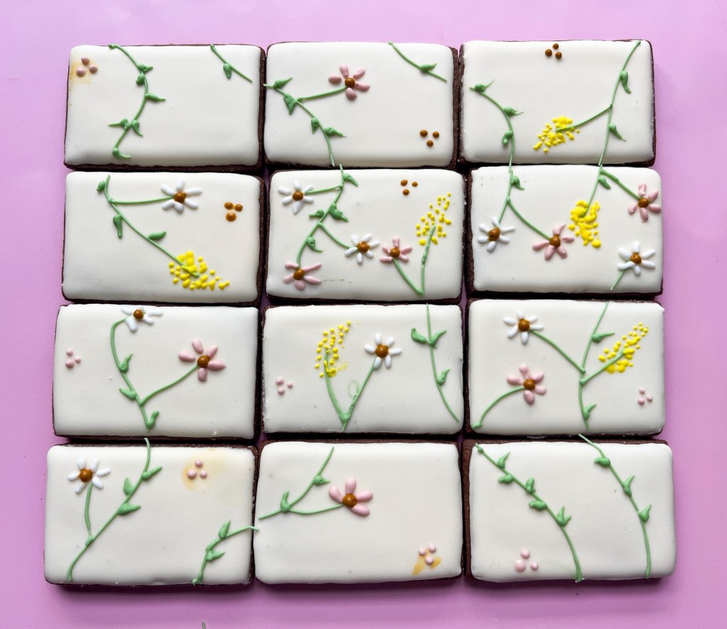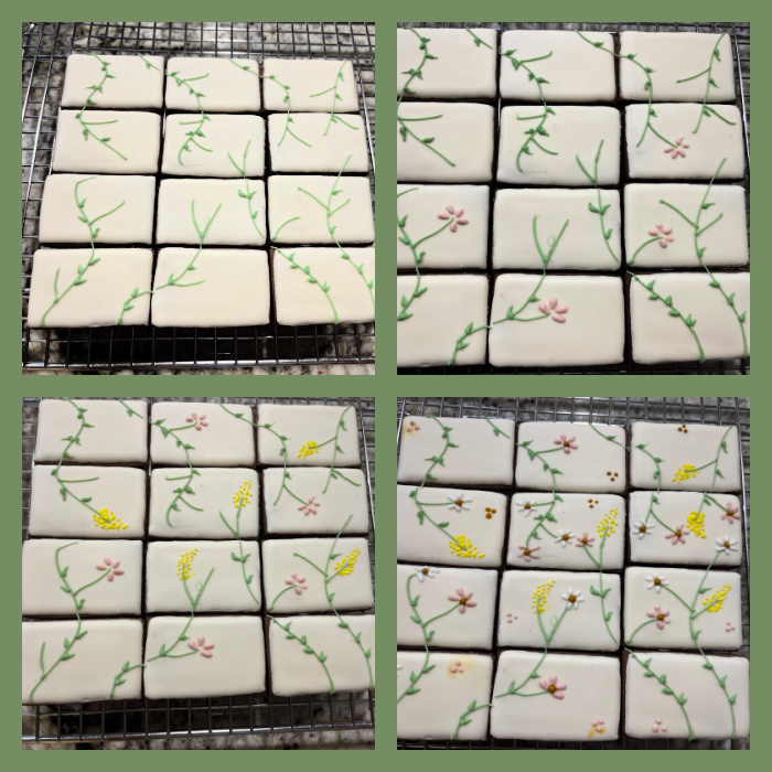 Flood the cookies, set the base set, then add all the details with piping consistency icing in green, yellow, pink, and white. Progression below…