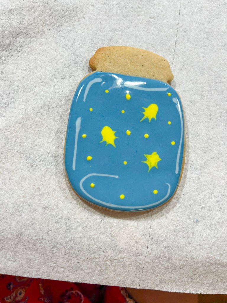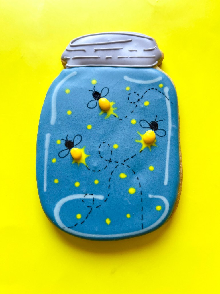 Flood the jar area with darker blue, add the lighter blue for details, and immediately decide where the fireflies will be. Those spots will be marked with a little oval yellow icing, that you will then pull to make a reflection using the needle. Pull just the lower half of the oval, as shown below. Add a few little yellow dots all around.