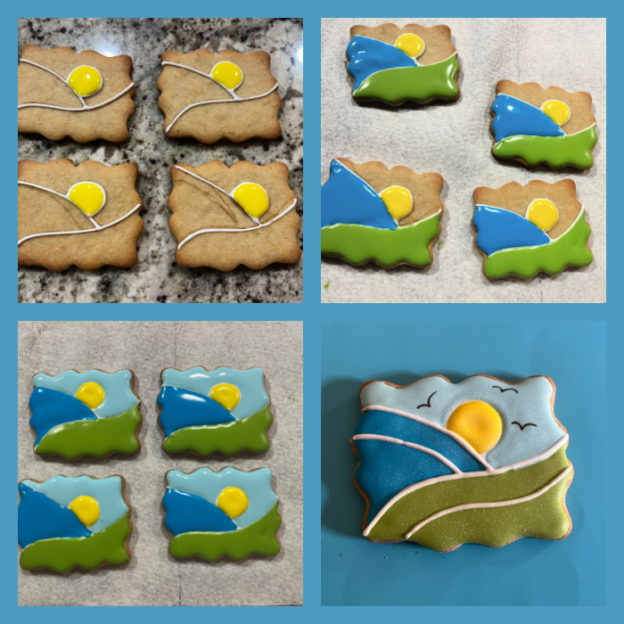 I pretty much used leftover icing to make these three cookies. Divided into sections, flooded each one. Black royal icing in piping consistency for the lines once it all set, to give the cookie a more polished look.