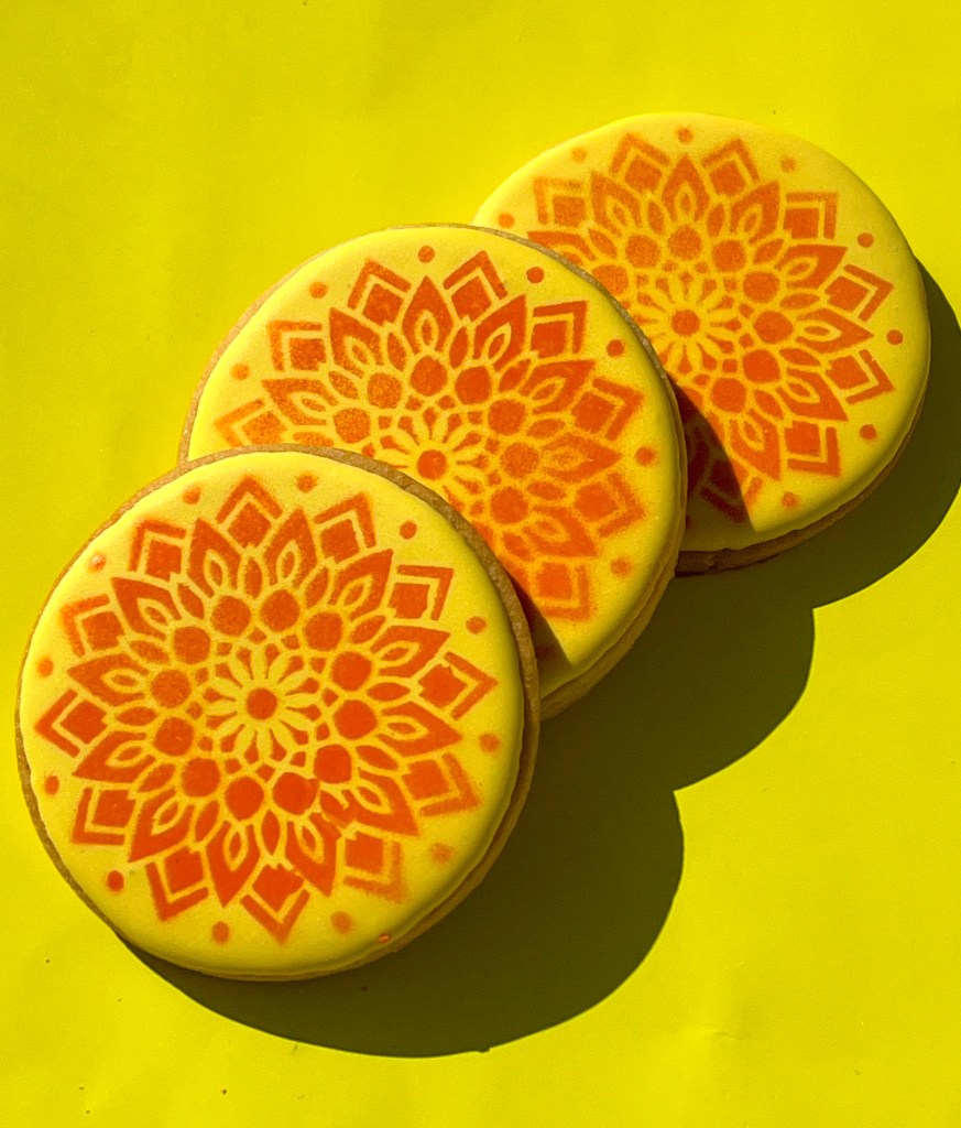Flood with yellow, use a stencil to add the pattern with air-brush orange color.