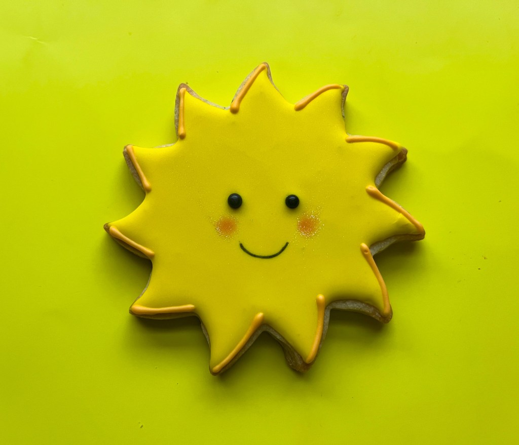 Super simple, flood in yellow, add black pearls for eyes. Once it all sets, add details with piping consistency orange, food pen for the smile, and a little blush.