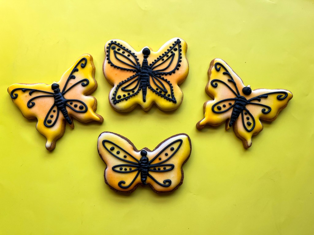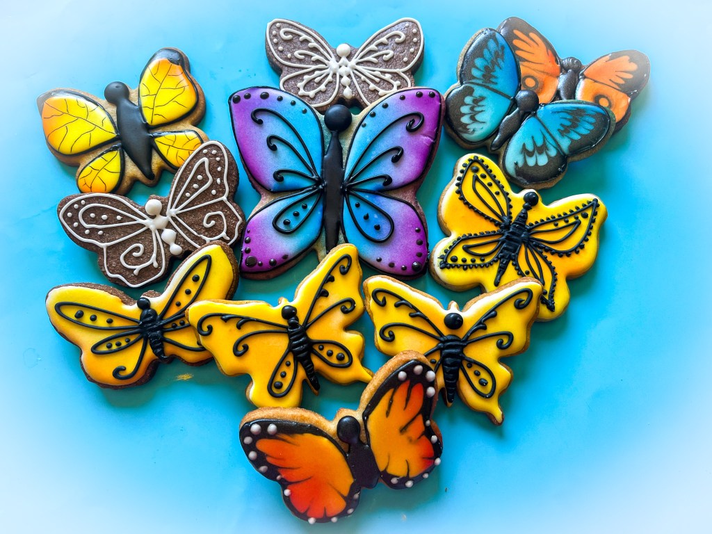 This past month Tunde published her tutorial on butterflies, using several different techniques to decorate them, including one I had never tried: air-brushing cookies while the Royal icing is still wet, right after flooding the surface. Pretty cool. In today’s post I share all the cookies I made following her tutorial, and very soon I will show you the cookies I made on my own inspired by her class. Stay tuned!