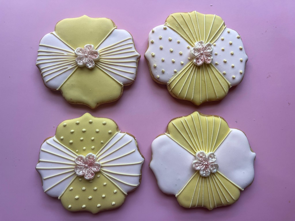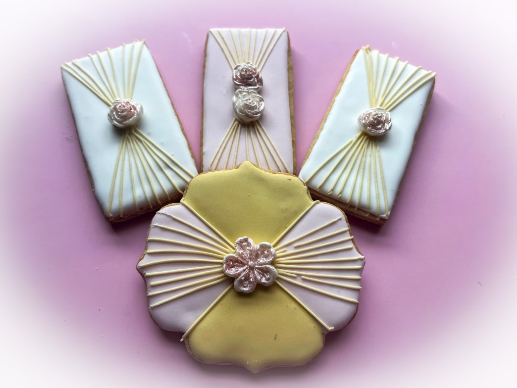 Simply flood the cookies with the desired color. When making the frame, use two different colors dividing the area in fourths. Let the base set, then add all the details with piping consistency, and glue the fondant (or modeling chocolate, if you prefer) decorative flower.