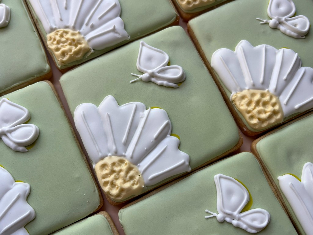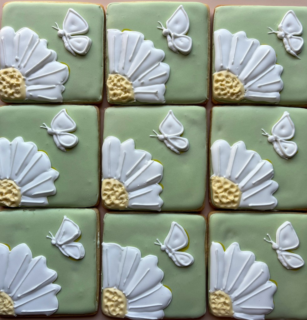 Choose an image for all your cookies, that will fit in a square shape. The process is then pretty straightforward, although you will need to get the Royal icing in perfect consistency for some puffiness of the petals and butterfly, and also pipe some fine lines to finalize them. See some of the stages below.