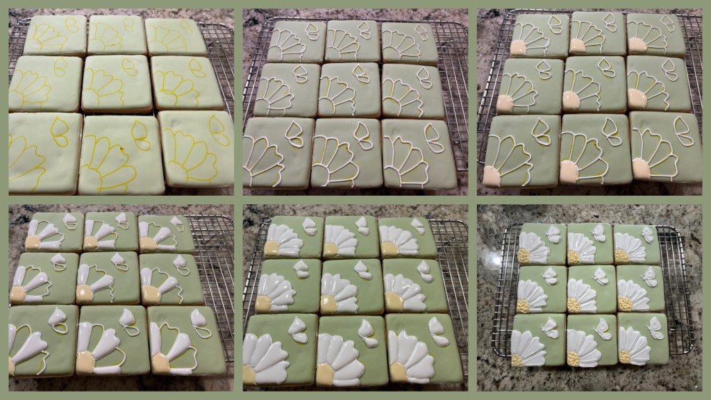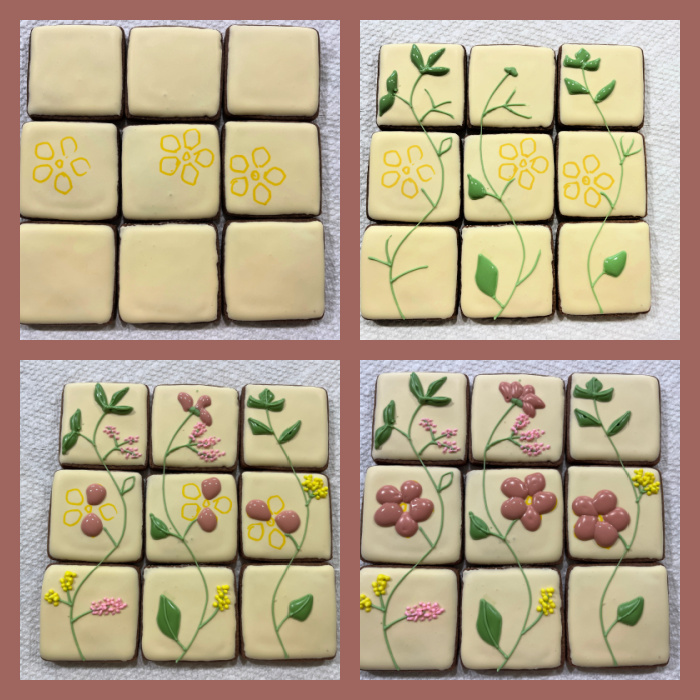 I’ve used this type of design in the past, and never get tired of it. Pretty much anything goes, but I started from a flower shape stencil to guide the piping of the large flower in the central cookie. Piping is done in stages to preserve separation between petals and little flower buds.