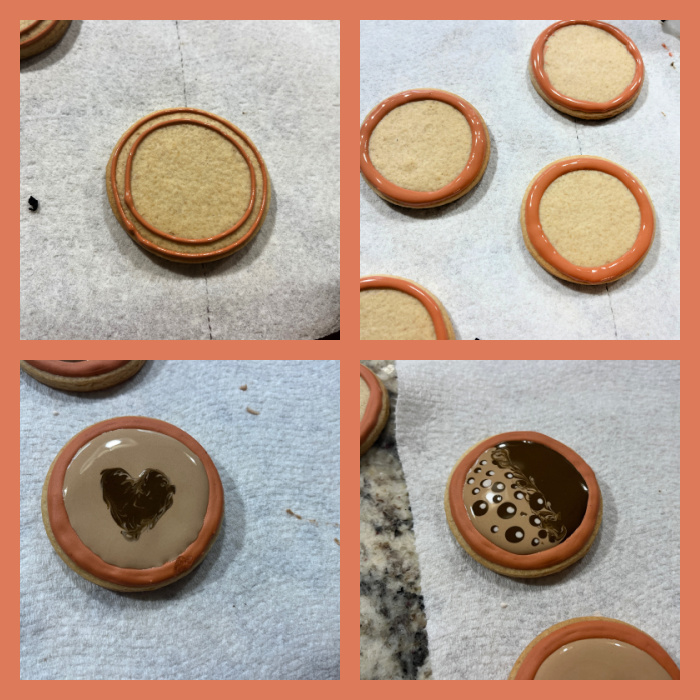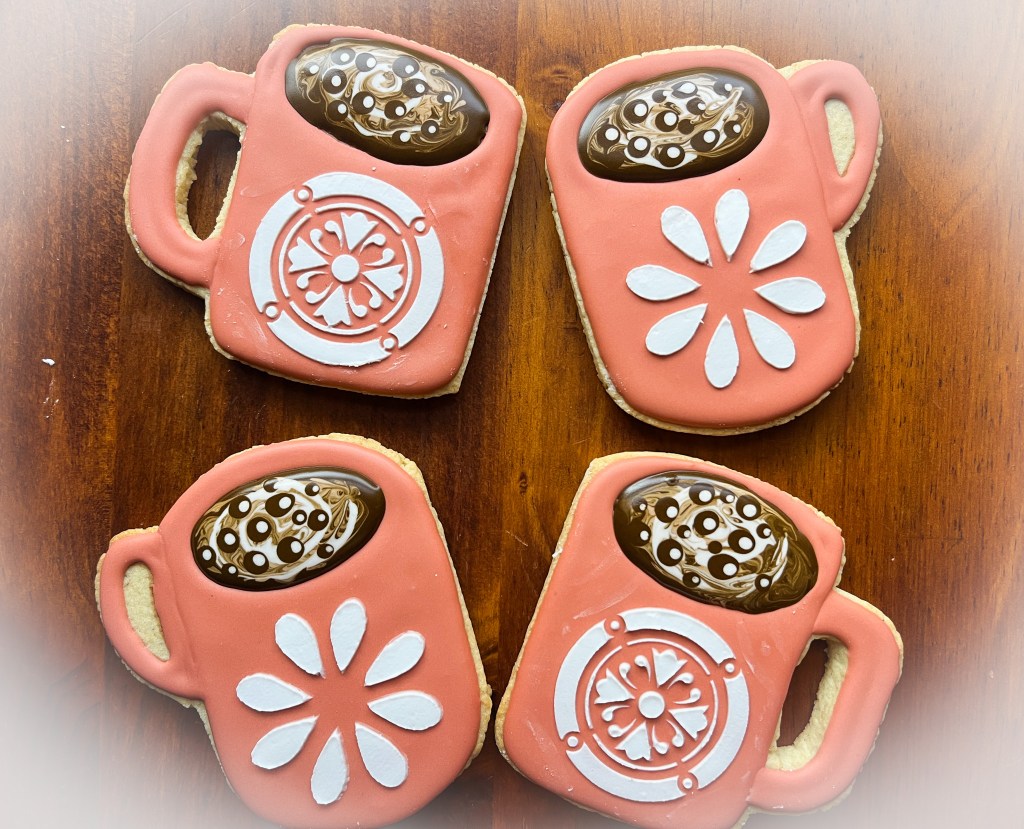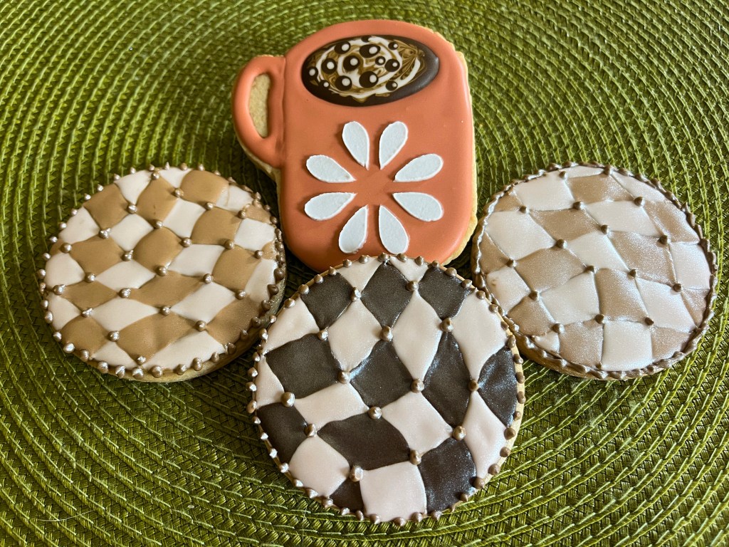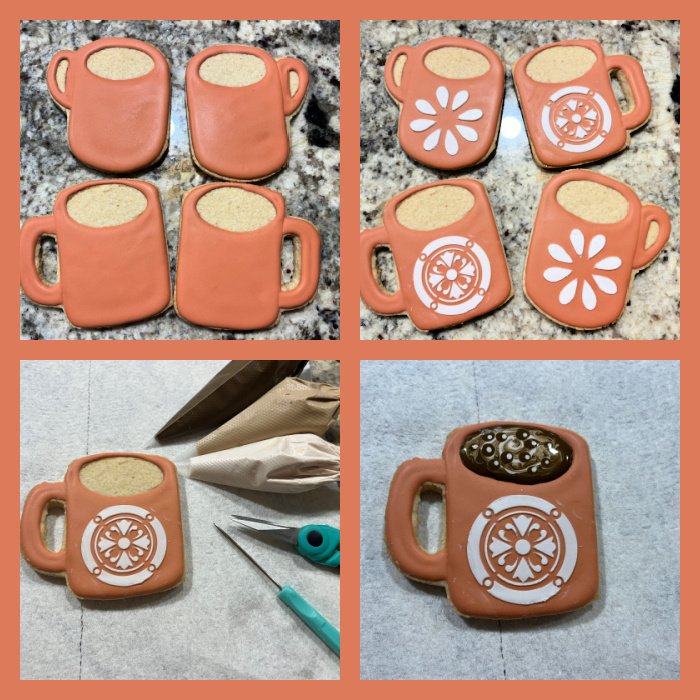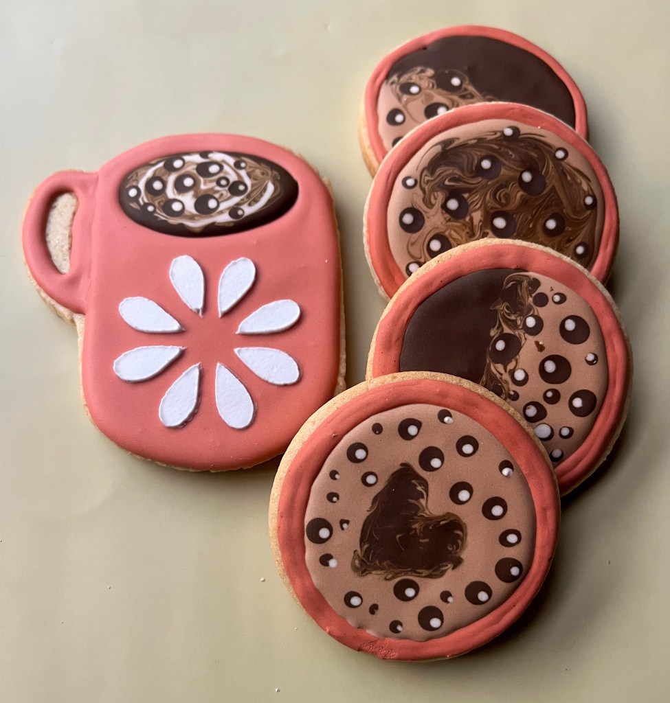 I love this set so much, perfect for those who cannot quite conceive starting a day without Java. Like yours truly. Decorating begins with flooding and allowing to fully set the background of the coffee mug cookie. Then, a stencil is used to add white icing as a decoration. Next, comes the coffee area, using Hani’s method to create bubbles. You can follow her tutorial visiting this video from 4 years ago.