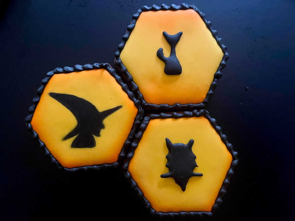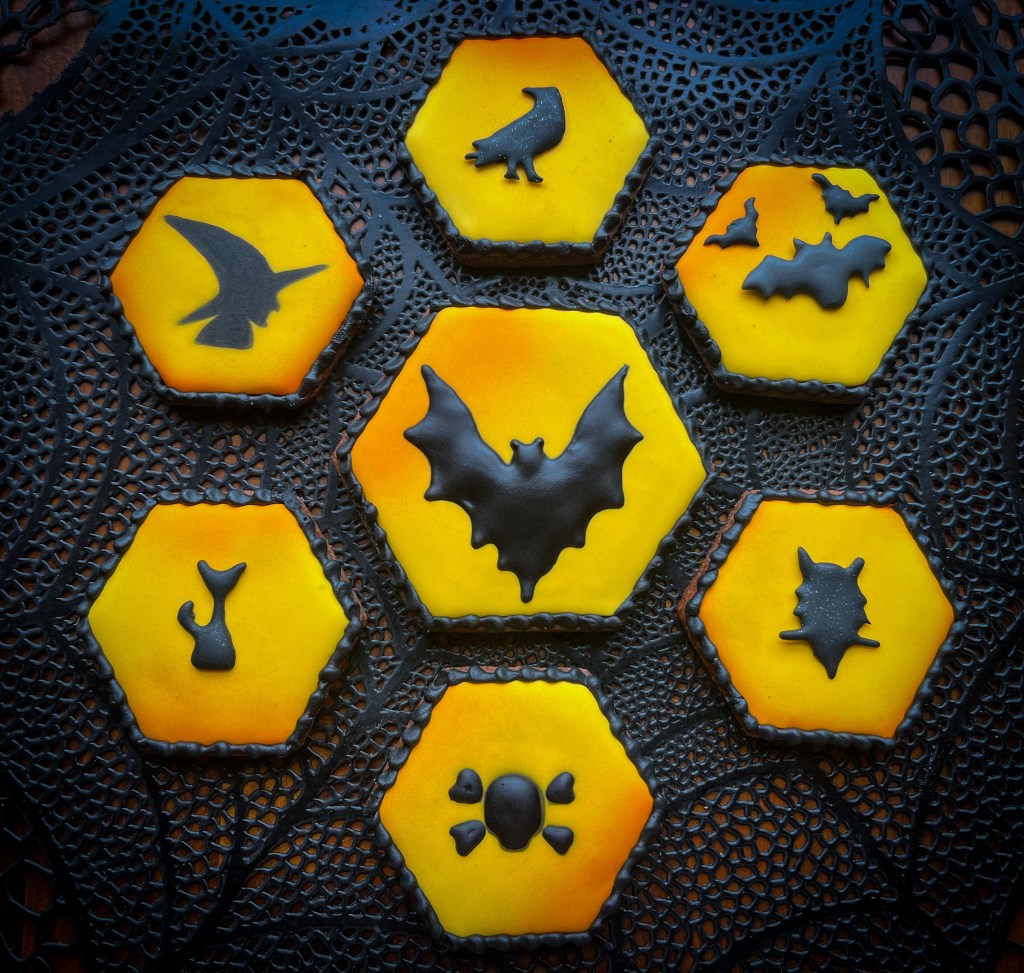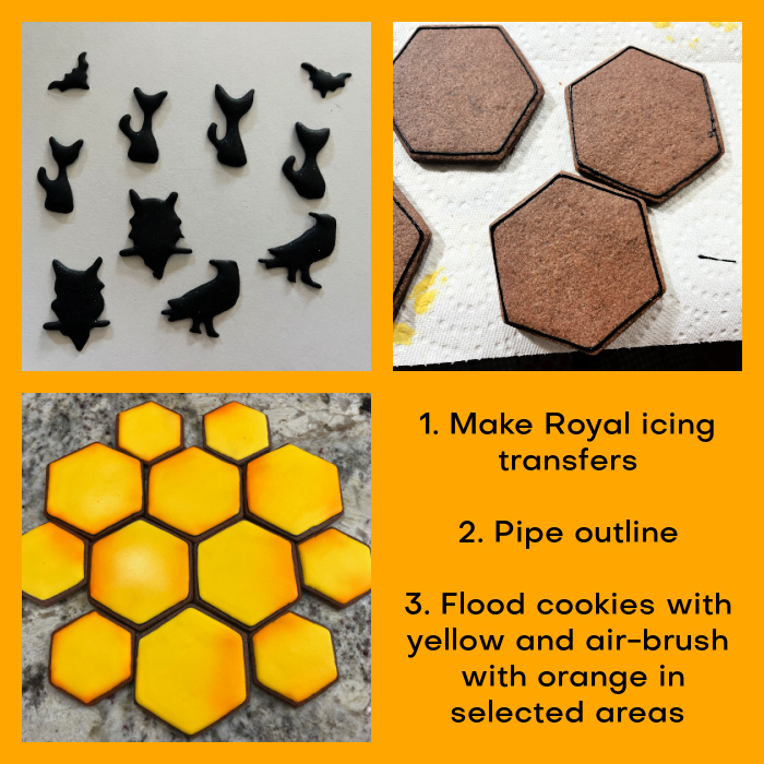 These cookies were made following the most recent tutorial from Tunde Dugantsi (click here to join her club). I love the way they flow together as a group, having in common the two-tone background, and images in black. I took some liberties with the design, using two different sizes of hexagons to accommodate stencils I had available. Six were large, six were small (about 3 inches for the small ones).