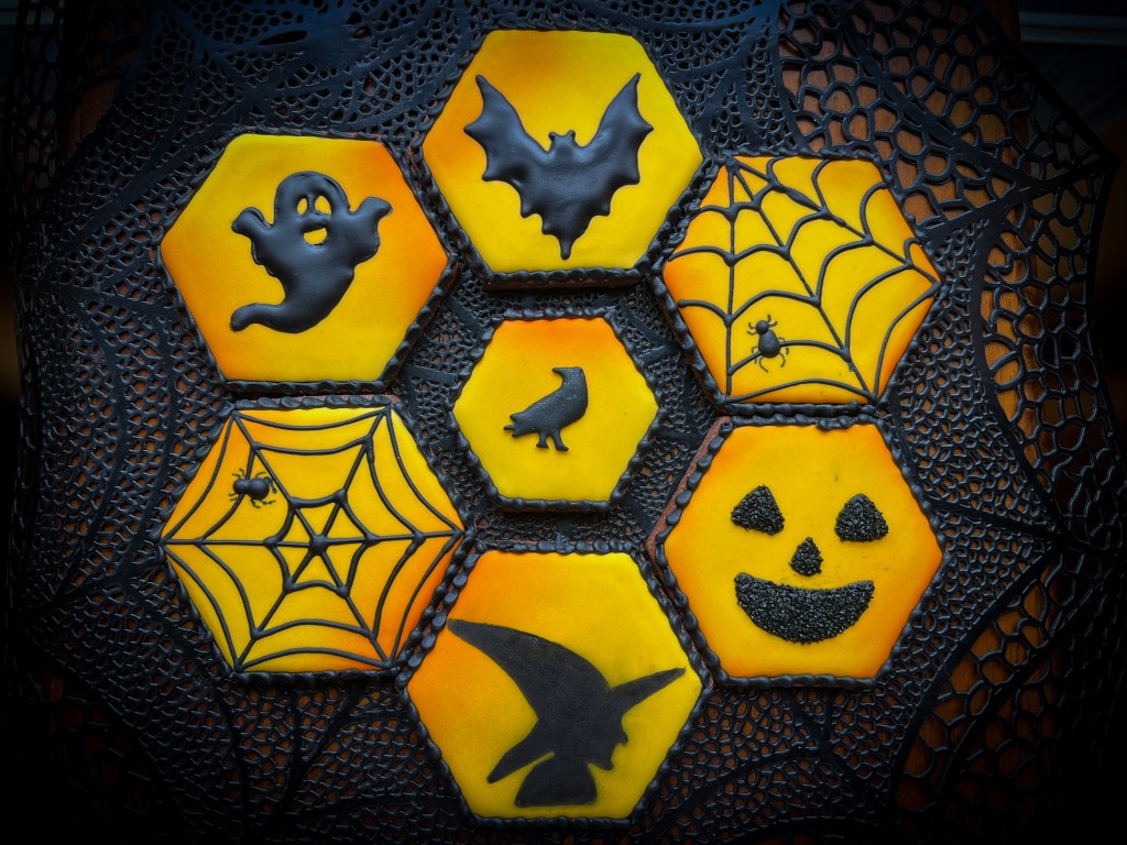 As to the images, you can use different techniques. Tunde provided templates for several different Halloween-inspired images to be piped as Royal icing transfers. I made several the day before so they were fully dry. If you don’t want to go that route, you can opt for air-brushing an image with a stencil, or using a projector to draw a design and pipe black icing over it. Finally, for the spider web all you need is piping consistency icing and a tipless bag. No need for templates, stencils or a projector.