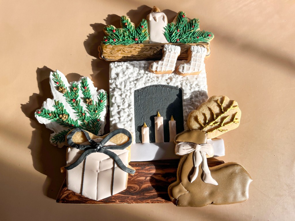 The whole set involved 10 cookies, 4 of them super small for the stockings. Many techniques were used, so I cannot say this is a beginner’s project. It is more medium to advanced, but absolutely doable as the instructions and videos are flawless. You get a ton of supporting material, from the cookie recipe to Royal icing and all the details for making the different colors and consistencies needed.