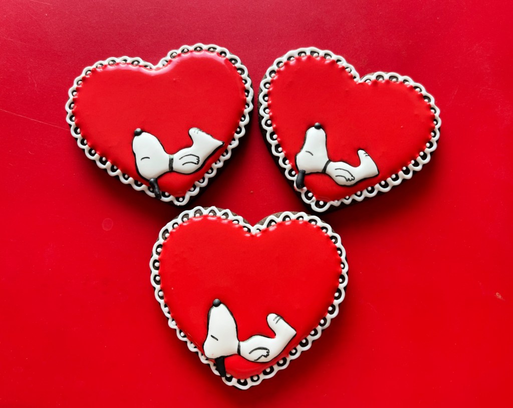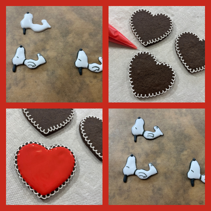 I made the little guys as Royal icing transfers, carefully sizing them to fit into the large cookie heart I used as the base. Then I piped a border, flooded with red, and glued Snoopy while the icing was still wet.