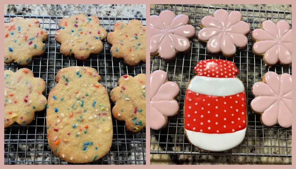 A lot of details, but her tutorial is flawless as always. Start by making all the buttons as Royal icing transfers (she provides the templates in her cookie club). Then it is just a matter of flooding, piping details and bringing it all together… I used a Birthday sprinkle cookie dough for these.