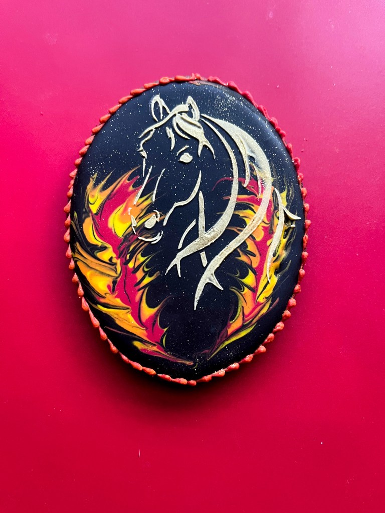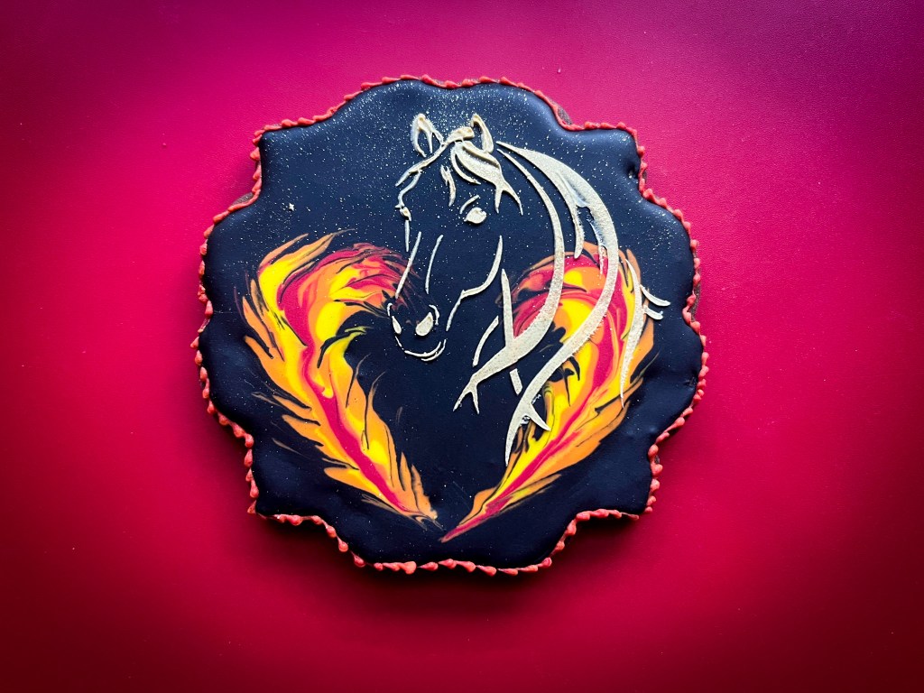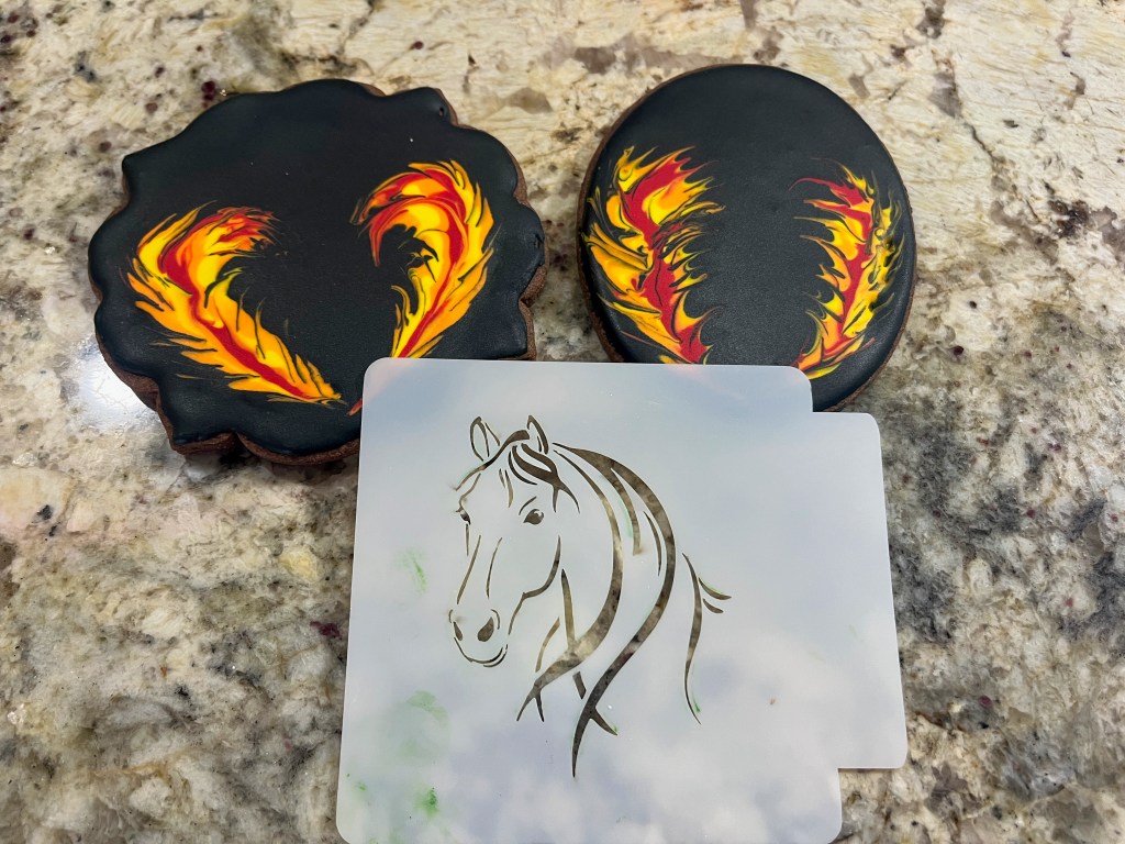 I flooded cookies with black icing and made the fire design leaving a space in the center for the horse stencil work.