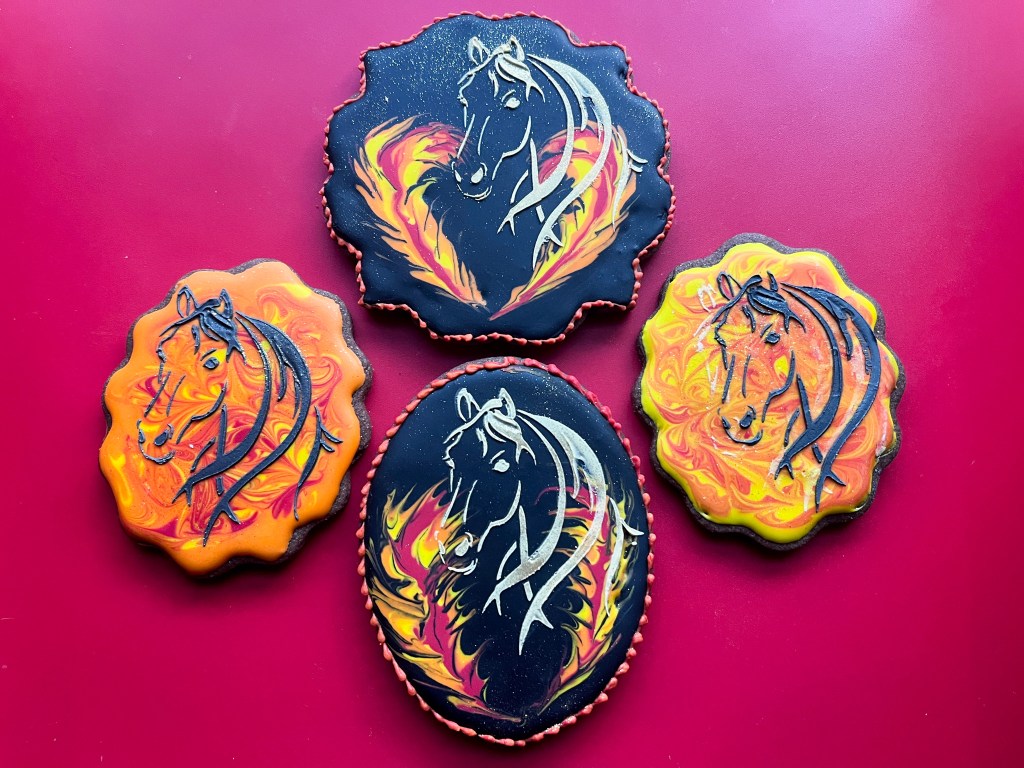 For a couple of cookies I went with a marbled background of orange, red and yellow, and added the horse with black icing.