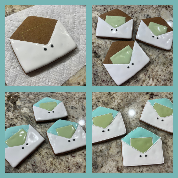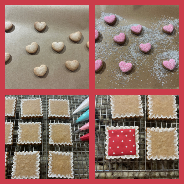 These are squares with a little tiny heart cookie glued after the center is flooded. Steps for making this set are shown below…