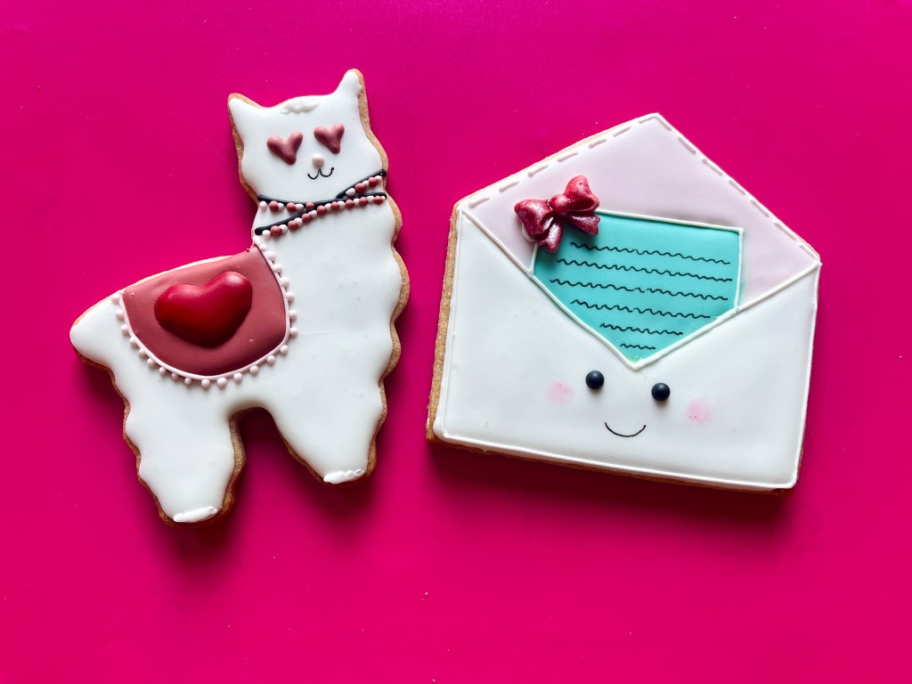 Pretty straightforward decorating for both, there is a need for fine line piping but not too complicated. The heart on the llama is chocolate, just like the heart hanging from the gnome’s hat. The cutter for the gnome, a double cookie set, is available here.