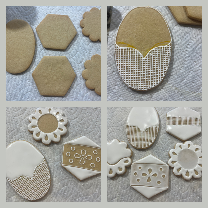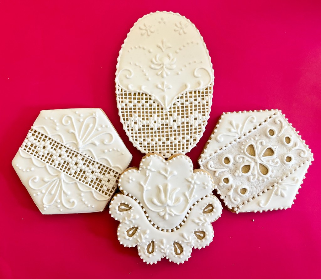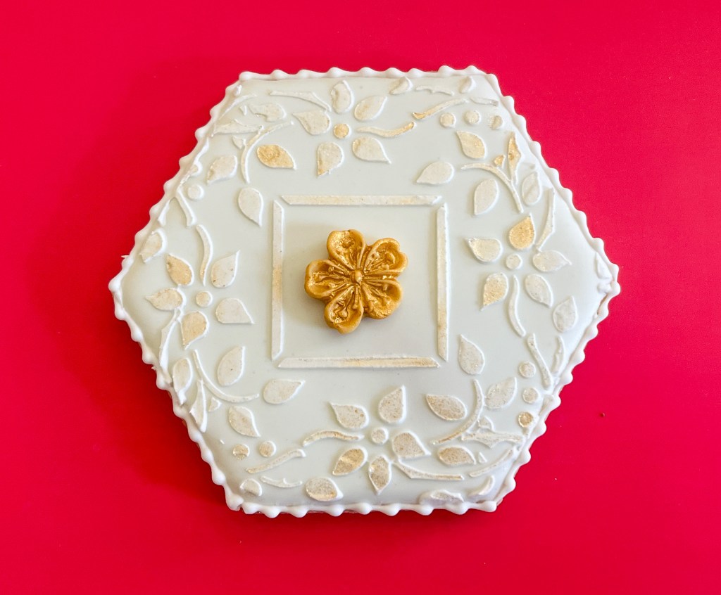Five cookies complete this beautiful set. Tunde used an 8-petal flower cutter, which I did not have, mine had ten petals so I had to adjust the design a bit. Several techniques were joined to bring this set to life: transparent glazing, grid piping, fine lines, and the piping of her trademark, the Hungarian flower, which is not easy to achieve. Some steps are shown below…