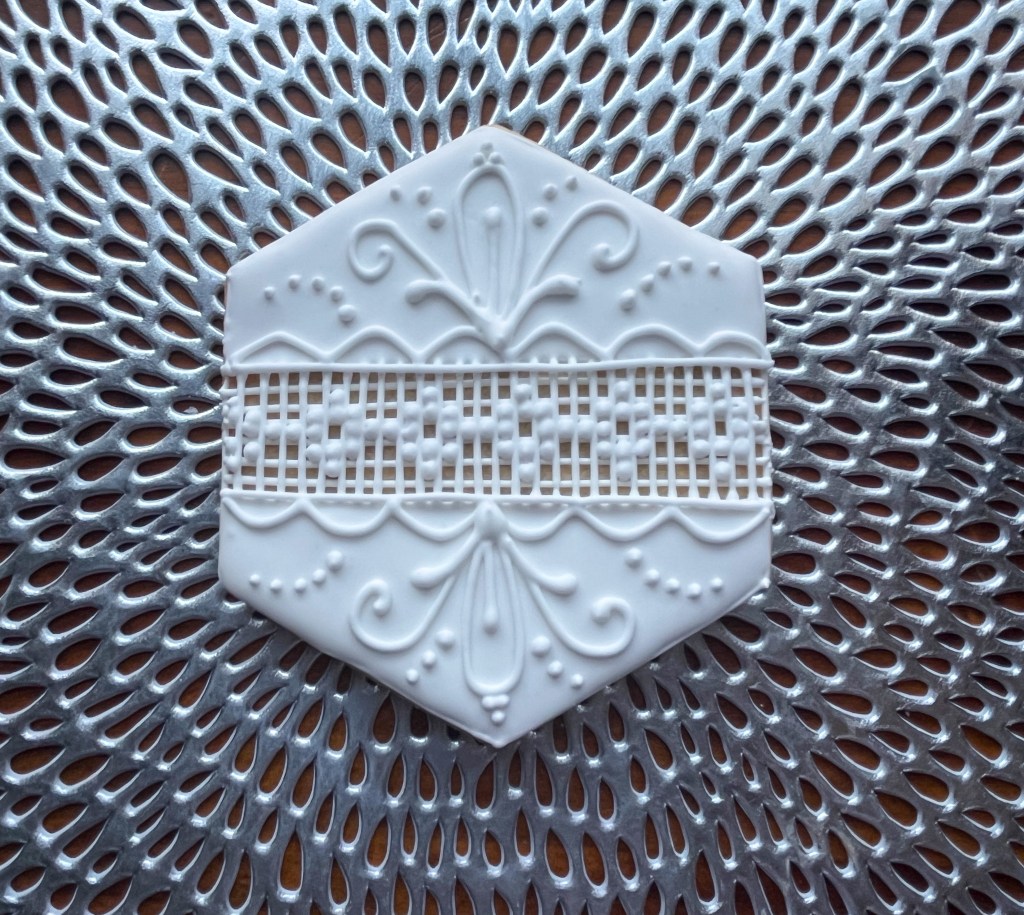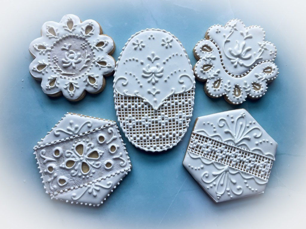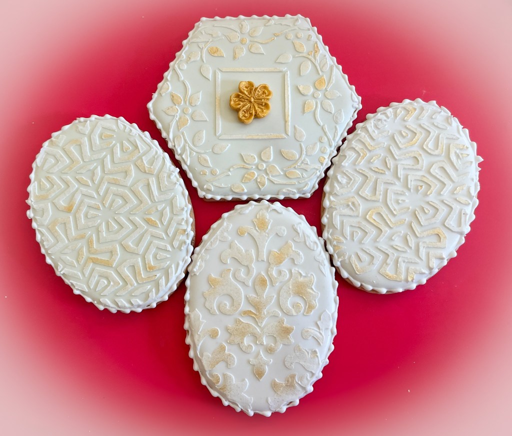 I wanted to donate a full set of cookies to hospice workers, so I made a few more with the basic idea of white on white to go alongside in the box. These were my own design, using stencil and Royal icing on flooded, set cookies. They have a little bling added, which I am sure does not surprise you…