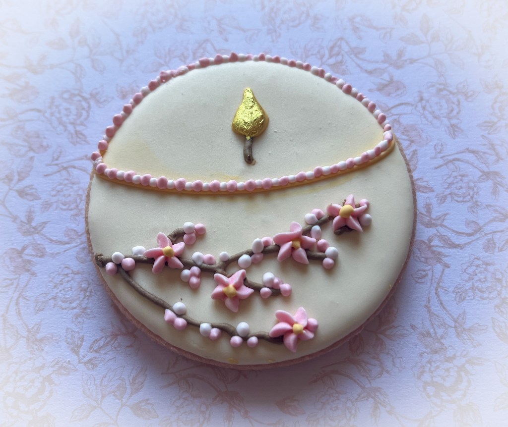 The cherry blossoms are made with a drop flower method, using a tip like #129. I made way too many and now I find myself adding them to all sorts of cookies, which…. come to think of it, is not that bad, is it?