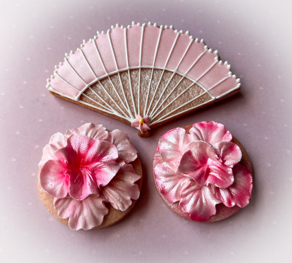 The fan was my own design, as well as some turquoise cookies that profited from the excessive amount of cherry blossoms I made as Royal icing transfers…