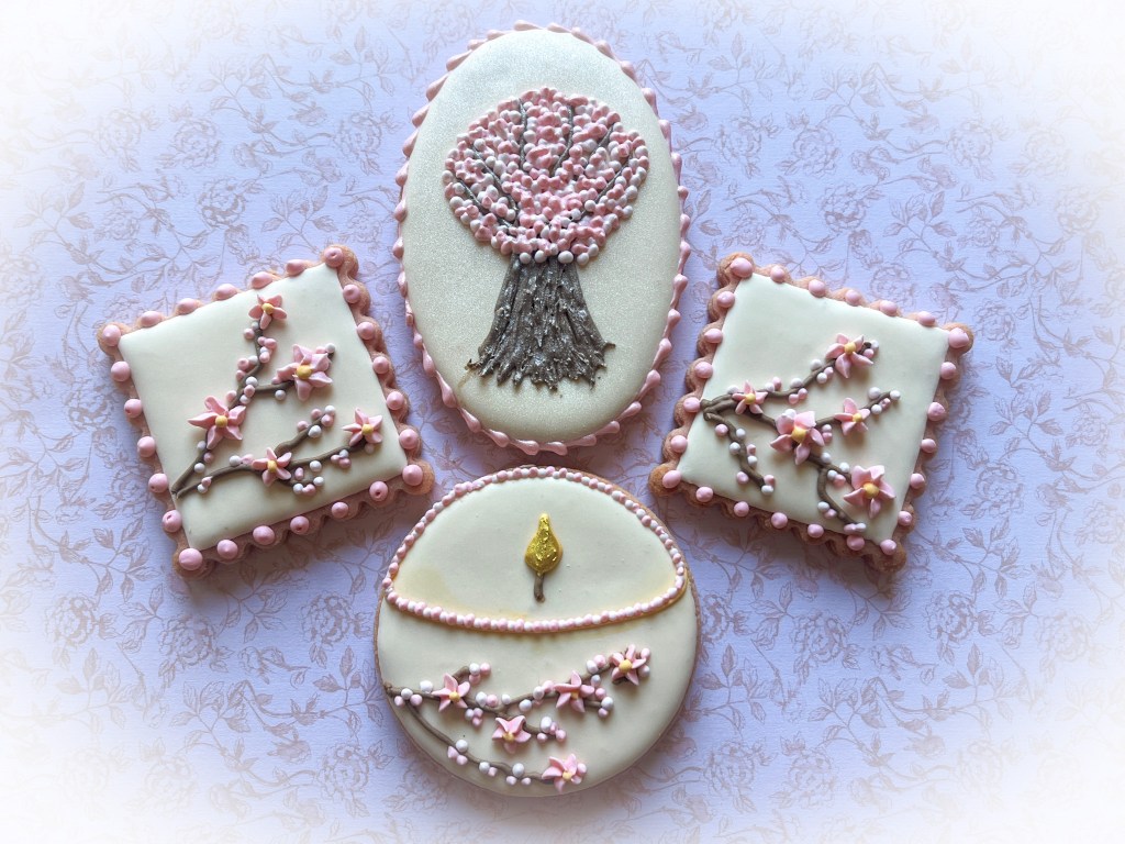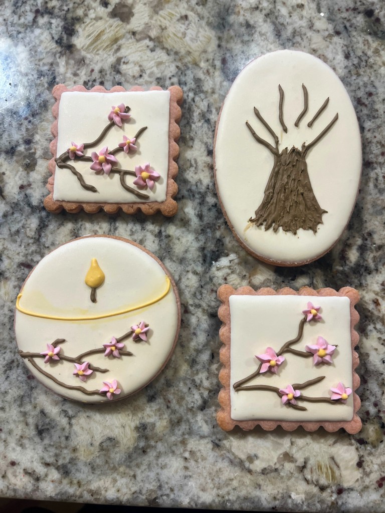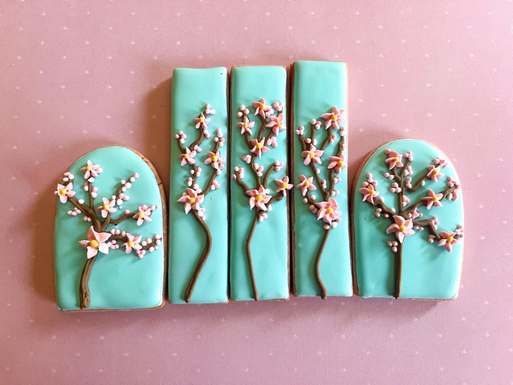 Cherry blossoms are delicate, elegant, and romantic. What’s not to like? Tunde captured their essence in a series of cookies that are not too complicated to make, starting with flooding, and piping the basic outlines of trees and branches.